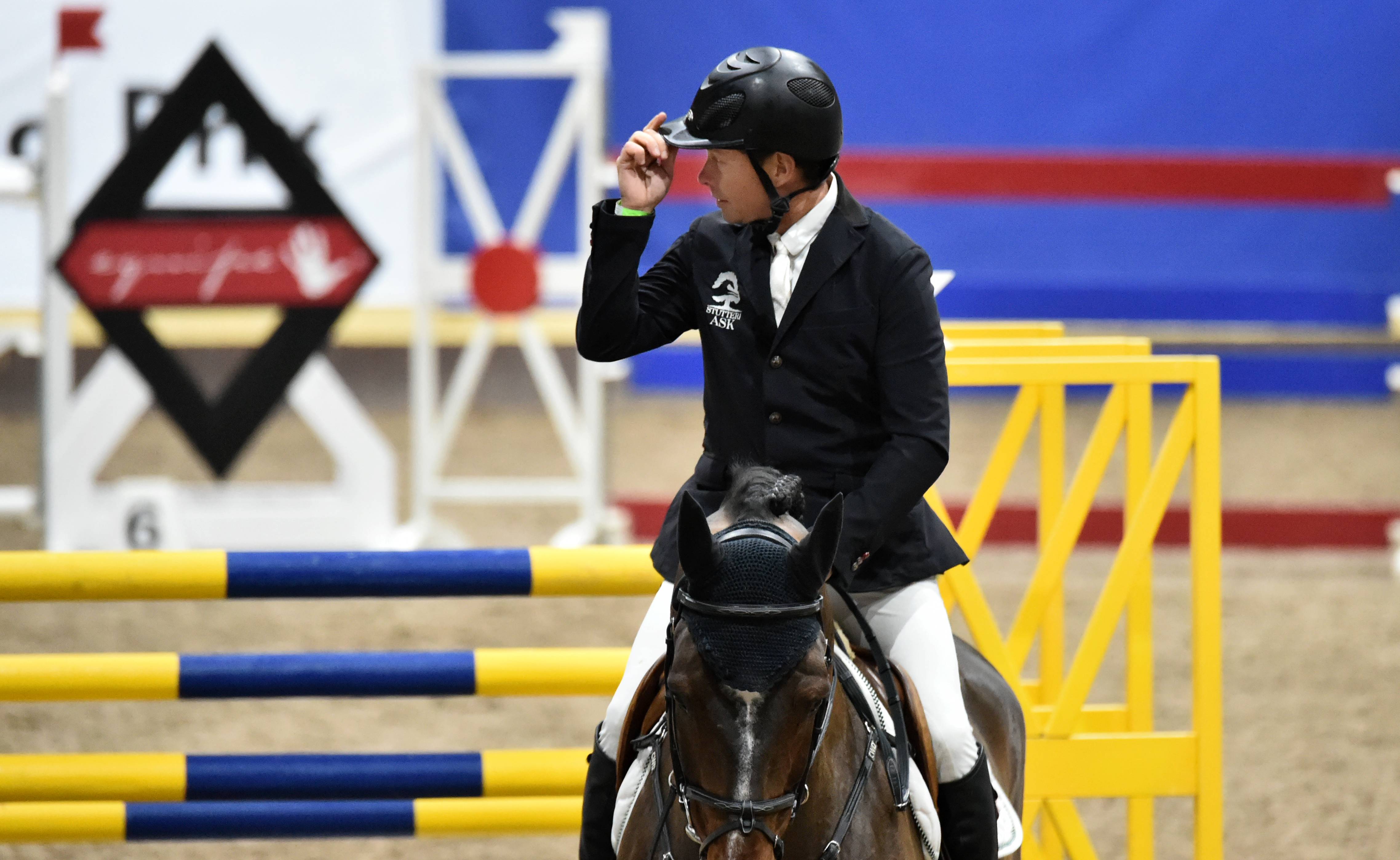 Rolf-Göran Bengtsson tävlade i hoppning på hemmaplan i Flyinge. Men tyvärr rev han sista hindret i första hoppningen.