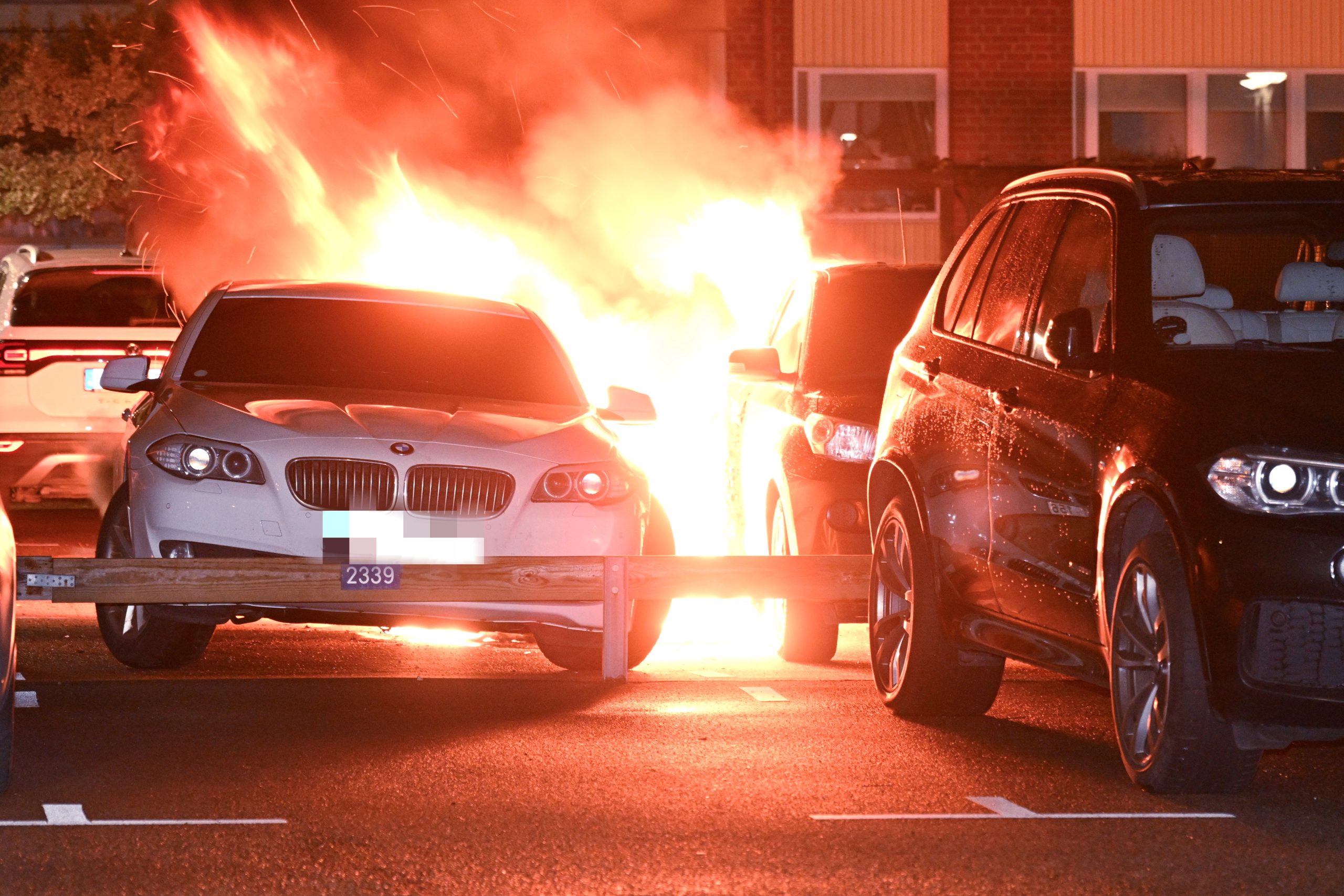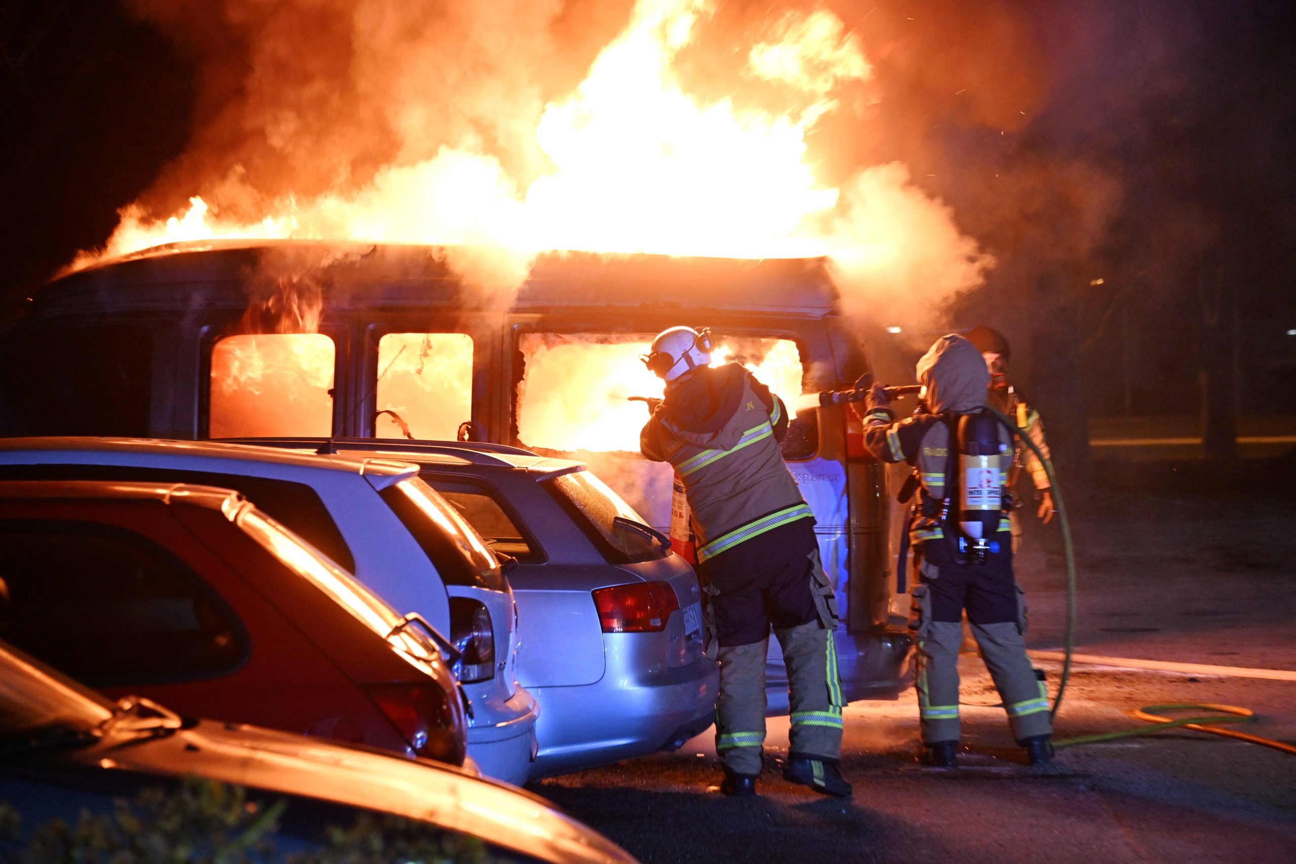 Nästa bilbrand kom vid 04.03 på Serenadgatan. När brandstyrkan kom fram brann två bilar på en boendeparkering. Rökdykare med pulversläckare och slangledning kunde slå ner…