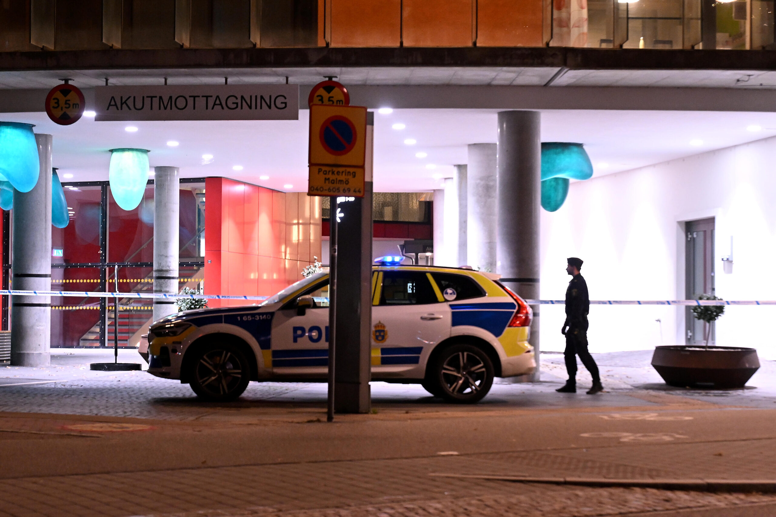 Polispatruller spärrade av akuten i Malmö med polisband dit den skjutne ynglingen fördes med ambulans.