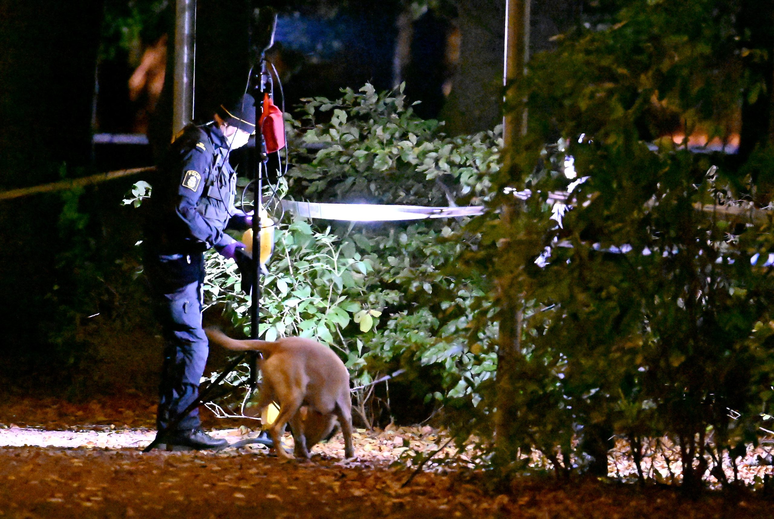 Polisens tekniker samt specialsökhund i Pildammsparken vid platsen för det misstänkta kvinnoöverfallet.