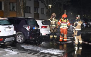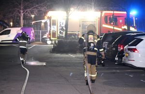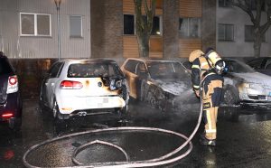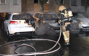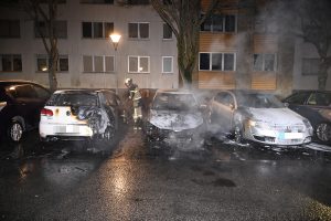 Brandkåren larmades vid 01.10-tiden till brinnande bilar på en boendeparkering på Hårdsväg Rosengård. När brandstyrkan från Jägersrostationen kom fram brann det kraftigt i två närstående bilar. Ytterligare två bilar hade fått värmeskador av bränderna. Rökdykare med både pulversläckare och slangledning kunde stoppa bränderna innan de spred sig vidare. Polis kom till platsen och upprättade en anmälan om skadegörelse genom brand.