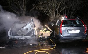 Fyra bilar brann i natt på två olika ställen på en parkeringsplats vid Skarpskyttevägen i Lund. Brandkåren i Lund och Löddeköpinge larmades vid 01.46 till bilbränder på Skarpskyttevägen i norra Lund. När brandstyrkan från Lundastationen kom fram brann det på två olika ställen på en större parkeringsplats. Rökdykare med pulversläckare och slangledningar kunde släcka ner bilbränderna på ca 20 minuter. Enligt uppgift på platsen har två personer setts springande lämna platsen i samband med att bränderna startade. Polisen har upprättat en anmälan om skadegörelse genom brand.