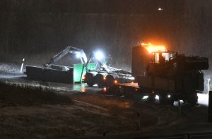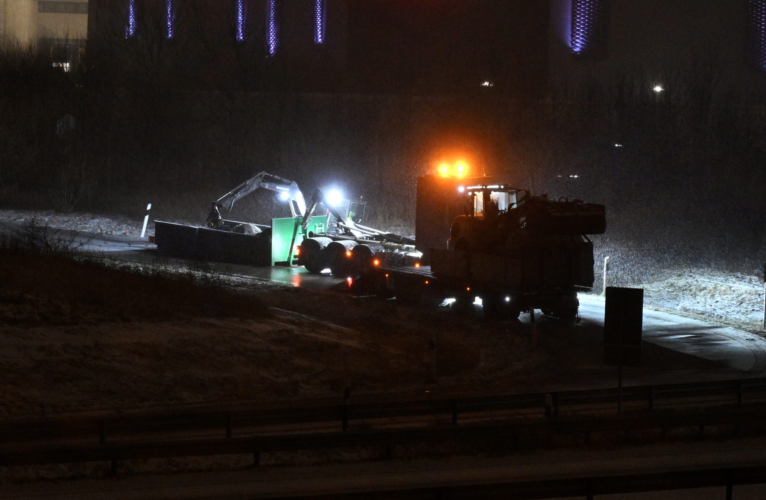 På påfarten till väg 11 från Yttre Ringvägen höll man fortfarande på med sanerings och bärgningsarbetet av en lastbil vid 23.30-tiden. Den aktuella påfarten var avstängd och förväntas inte öppnas förrän tidigast vid 01 i natt.