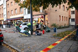Bilist körde in i frisörsalong på Bellevuevägen vid 17.10-tiden. När brandstyrkan från Hylliestationen kom fram stod bilen inkörd vid frisörsalongen med två skadade fortfarande kvar i bilen. Bilföraren hade enligt flera vittnen drabbats av hastig sjukdom och tappat kontrollen över bilen som körde över gatan och upp på gångbanan för att slutligen hamna i väggen vid frisörsalongen. Först tog brand och ambulanspersonal hand om den sjuka bilföraren och sedan klipptes taket av för att kunna ta ut den skadade passageraren på ett säkert sätt. Annan brandpersonal tätade ett element i frisörsalongen som sprungit läck när bilen kraschade mot fasaden. Ingen utom de i bilen skadades vid den våldsamma olyckan. Polisen misstänker inget onykterheters brott i samband med olyckan.
