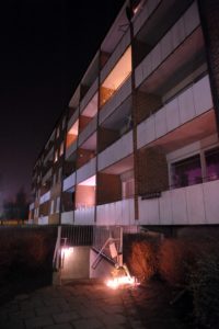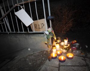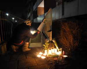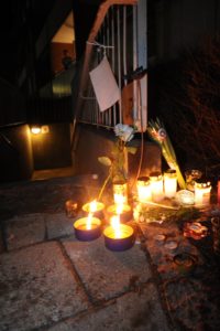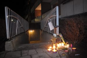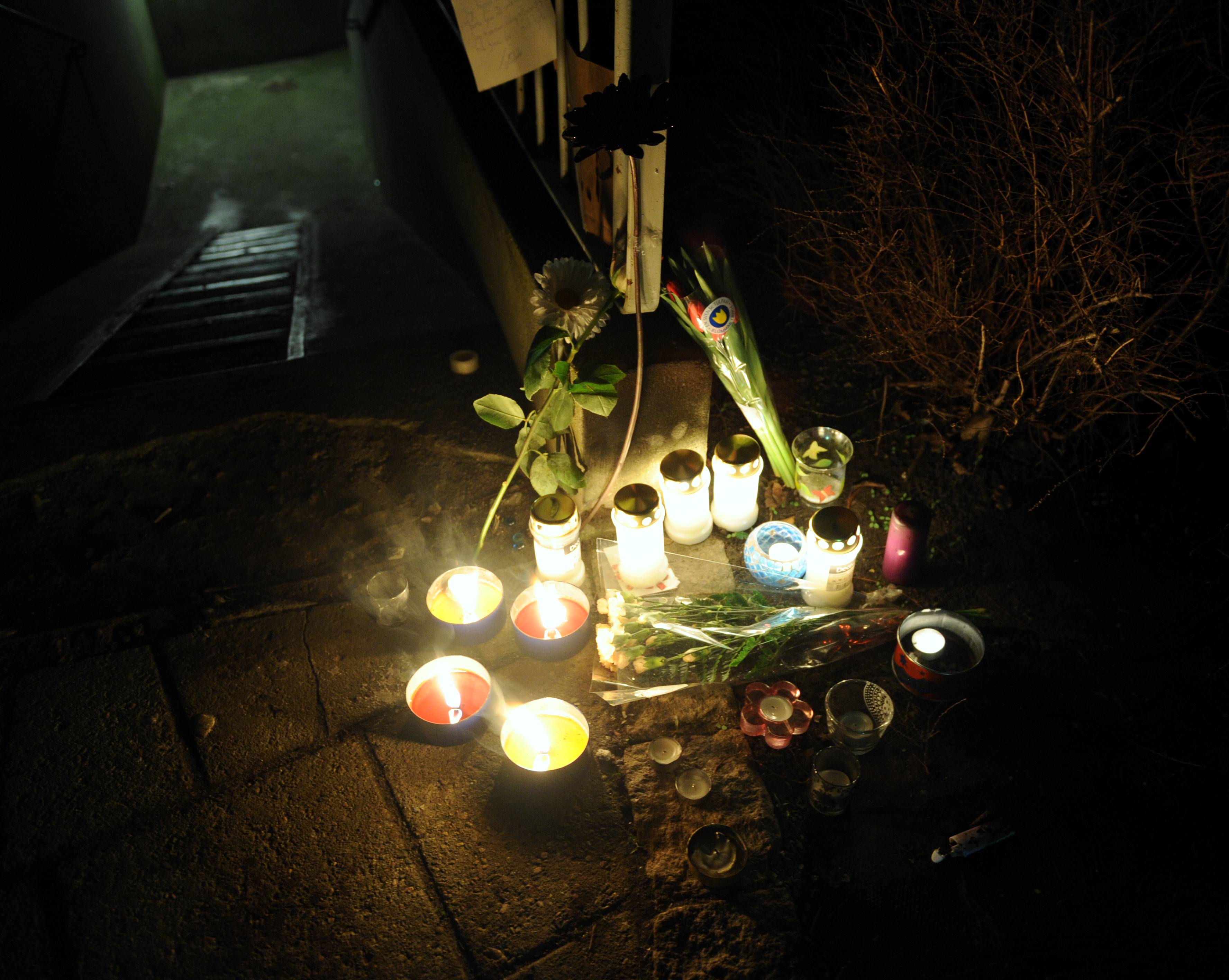 På bilderna blommor och ljus vid dödsplatsen på Docentgatan. En ung kvinna föll från fjärde våningen och dog på Docentgatan i Malmö vid 20.30-tiden i kväll. Två personer på platsen greps misstänkta för att ha del i dödsfallet. Polisens tekniker undersöte under kvällen och natten platsen. Flertalet grannar hördes av kriminalpolis om händelsen. Enligt uppgift skall bråk förekommit i lägenheten innan den unga kvinnan föll från balkongen.