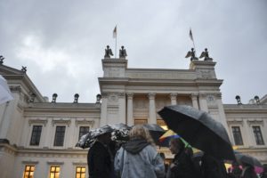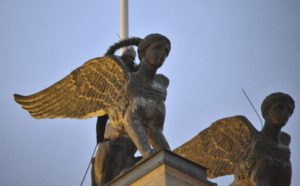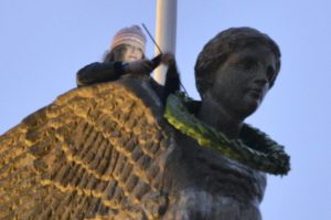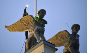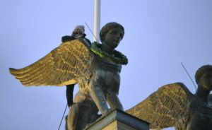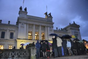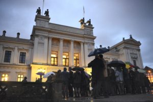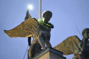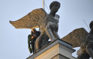 Boelspexarna lägger krans om Sfinxerna på universitetshuset i Lund