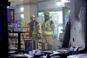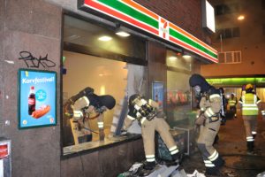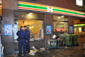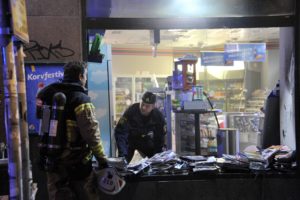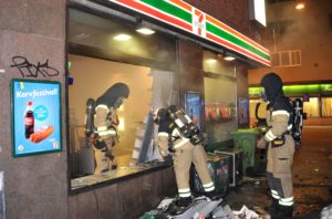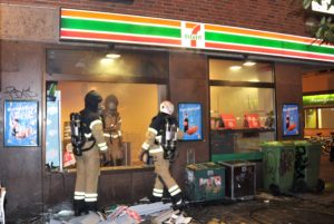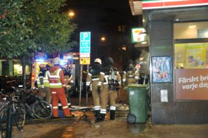 Brandattentat mot Seven Eleven butiken på Södra Förstadsgatan vid 03.30-tiden i natt. Brandkåren och polisen fick larmet vid 03.35 av boende som hörde glaskross och såg man lågor vid butikslokalen som vetter mot Möllevångsgatan. När första räddningsstyrkan från Centrumstationen anlände brann det kraftigt i ett större sopkärl som placerats vid ett av de stora skyltfönstren. Brand och rök hade spritt sig in i butikslokalen. Rökdykarna drog bort det brinnande kärlet och kunde snabbt släckte branden. Butikslokalen fick skador av rök och sot då fönstret var krossat av antingen branden eller skadegörelsen. Enligt brandkårens styrkeledare hade inte behövts många minuter till innan man hade haft en ordentlig brand i butikslokalen som ligger i ett större hyreshus. Rökdykare sattes in i butikslokalen för utluftning av brandrök. En tryckande rökfläkt sattes i ett garage och på så sätt tömdes butiken på brandröken. Polisen upprättade en anmälan om mordbrand då det förelåg stor spridningsrisk.