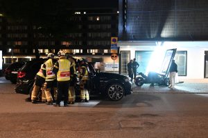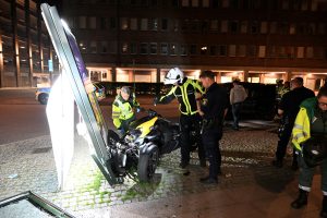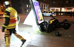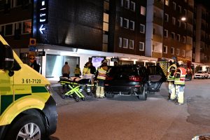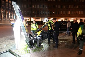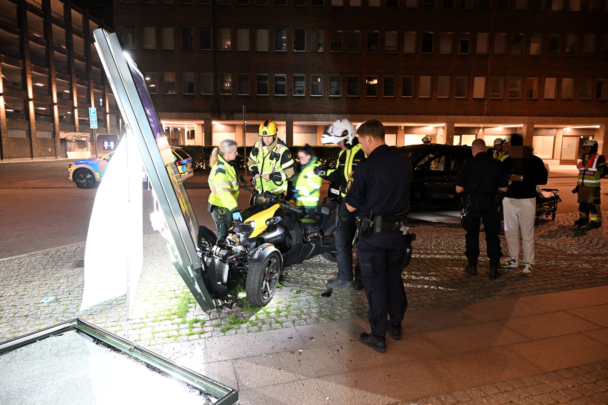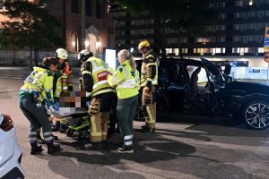 Brandkår och ambulanser larmades vid 01.54 till en singelolycka med en trehjuling på Kattsundsgatan i centrala Malmö. Fordonet med två personer hade kört in i en reklamskylt. En kvinna skadades och fördes in i en personbil i väntan på ambulans. När räddningsmanskapet kom fram fick kvinnan lastas på en specialbår och brand och ambulanspersonal hjälptes åt att ta ut den skadade kvinnan från bilen. Polis kom till plasten och förhörde föraren av trehjulingen. Vad som orsakat den våldsamma singelolyckan är oklart i nuläget.