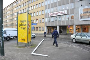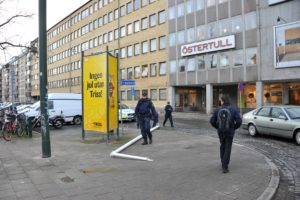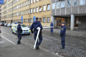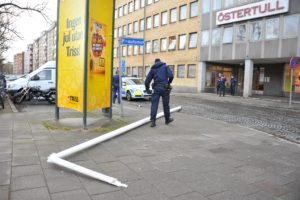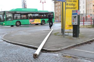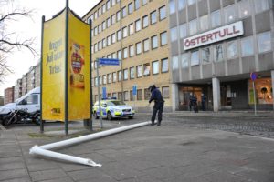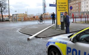 En flaggstång blåste vid 15-tiden ner från en sjuvåningsfastighet på Östra Promenaden i Malmö. En bilist som kom körande på gatan var nära att träffas av den fallande flaggstången. I den byggnad som flaggstången föll från finns bland annat Åklagarmyndigheten i Malmö. Polisen larmades till platsen och flyttade den stora flaggstången från gatan och gångbanan. I nuläget är det oklart om polisen upprättat någon anmälan om framkallande av fara eller något annat brott.