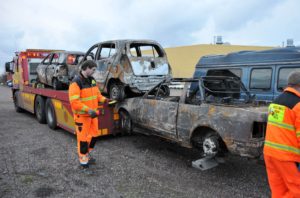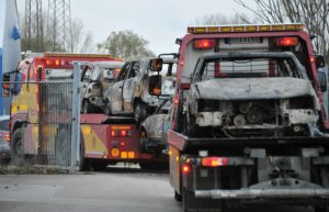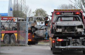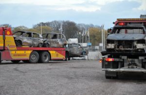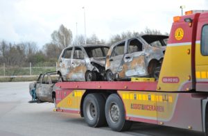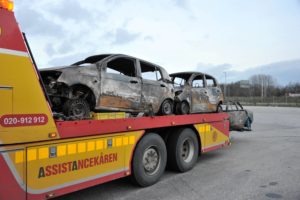 Fyra bilar totalförstördes vid en brand i en större carport tillhörande en fastighet i Stora Slågarp vid 17.30-tiden på onsdagen. I dag bärgades bilarna som blev helt utbrända till en uppställningsplats i Malmö.
