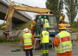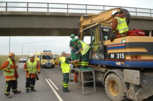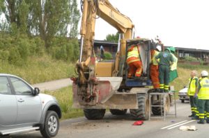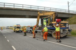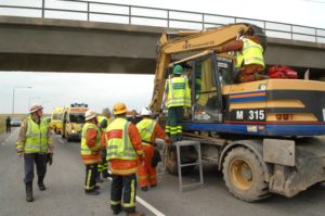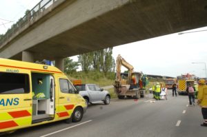 Föraren i en grävmaskin skadades när han körde in i en järnvägsbro utanför Oxie i dag vid 17-tiden. Grävmaskinisten var på väg mot Malmö på väg 101 och hade bommen allt för högt för att komma under järnvägsbron. Smällen blev kraftig och föraren fick tas ut av brandpersonal som samarbetade med ambulanspersonal på olycksplatsen. Trafiken stängdes i båda riktningar på väg 101 i samband med räddningsarbetet.