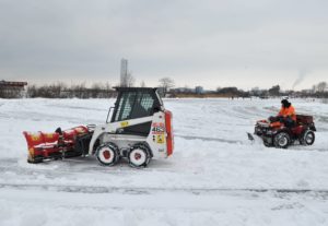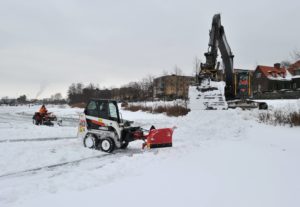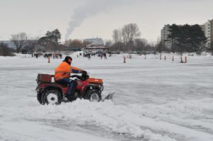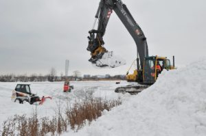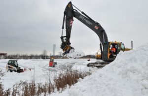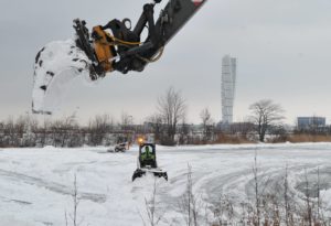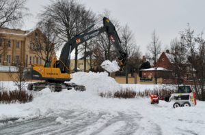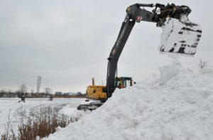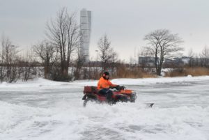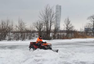 Flertalet snöröjare med både stora och små maskiner skottade snö på isarna på Ribersborgsdammarna under eftermiddagen. För några veckor sedan hade man bara skottat isen och lagt upp några snöberg på isen. Efter ett tag spräcktes isen av tyngden på snömassorna och det bildades farliga områden på isen runt där snön legat. För att undvika detta användes en större grävskopa som tog upp snömassorna en bit på land för att undvika skadorna på isen.