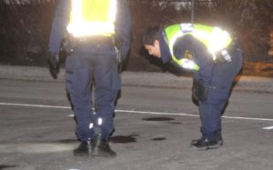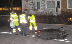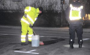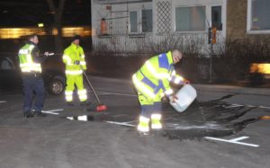 Vid 23.30-tiden sanerade kommunens gatujour bort de sista spåren efter det blodiga skottdramat på Fosievägen. Två personer från kommunens gatujour kom till platsen och sanerade bort blodpölen med saneringsvätska.
