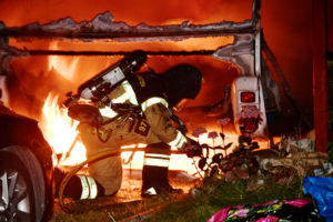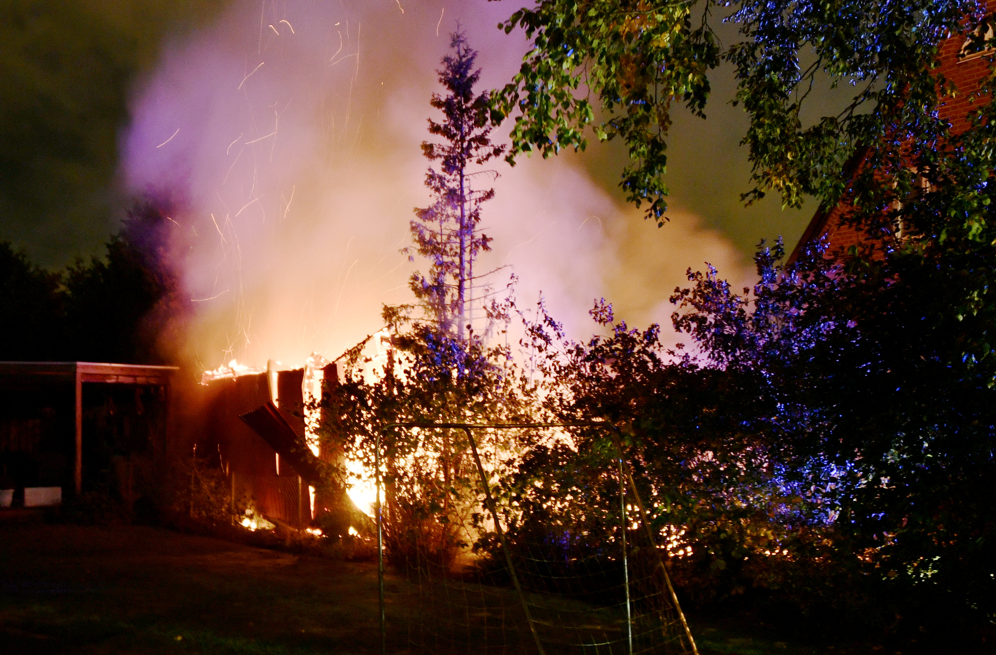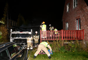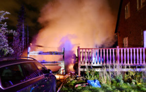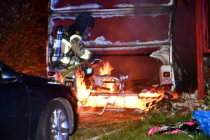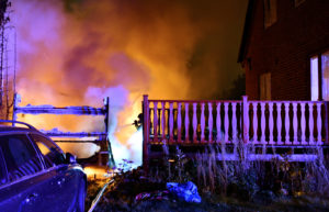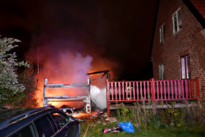 Kraftig brand i carport och husvagn på Ilixgatan