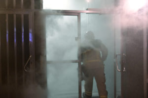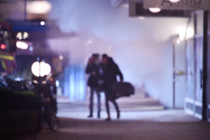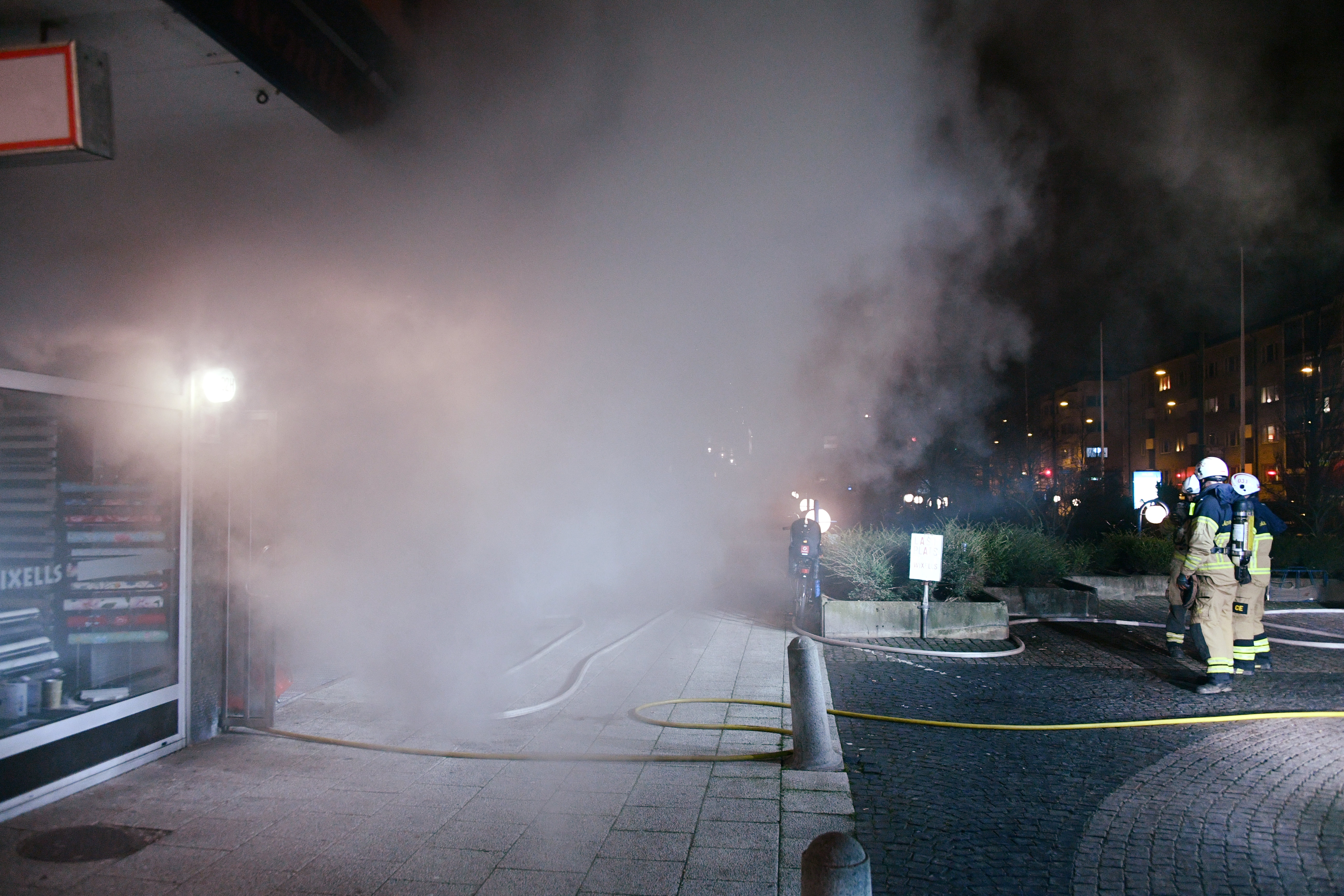 Brandkåren larmades vid 22.55-tiden till rök i trapphus på Mariedalsvägen Kronprinsen. När brandstyrkan kom fram bolmade rök ut från två trapphus och fler styrkor larmades till platsen. Snabbt kunde man konstatera att det brann kraftigt nere i källaren. Rökdykare skickades in för släckning och efter en stund skickades fler rökdykare in i källaren där flera källarförråd stod i brand. En del personer valde att ta sig ut i de rökiga trapphusen och ut på gatan. En del av dessa personer fick i sig mindre mängder brandrök. Flertalet andra hyresgäster i 9 våningshuset klagade på att rök trängde in i deras lägenheter. Brandpersonal tog sig in i de berörda trapphusen och öppnade rökluckorna så röken skulle lätta. Efter ca 30 minuter hade rökdykarna släckt ner branden och röken avtog. Vid 23.20-tiden stängde polisen av Mariedalsvägen för biltrafik så att brandpersonalen lättare skulle kunna jobba på platsen. En av de boende i fastigheten upplyste brandpersonalen att det inte var så konstigt att det brann då källardörrarna nästan alltid är olåsta i fastigheten. Hur branden startat är i nuläget oklart.