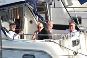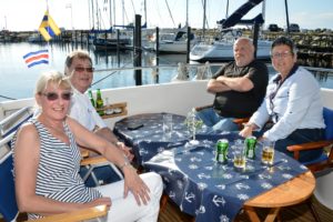 Två par firade under eftermiddagen midsommar i en båt. Georg berättade att de startade vid 15-tiden men då regnade det ordentligt och de var tvungna att sitta under kapellet. Men vid 17-tiden klarnade det upp och solen tittade fram. Kapellet åkte delvis av och vid 18-tiden satt paren och solade. "Vi ska senare gå ner och grilla och kanske spela lite boule", säger Georg avslutningsvis.