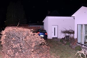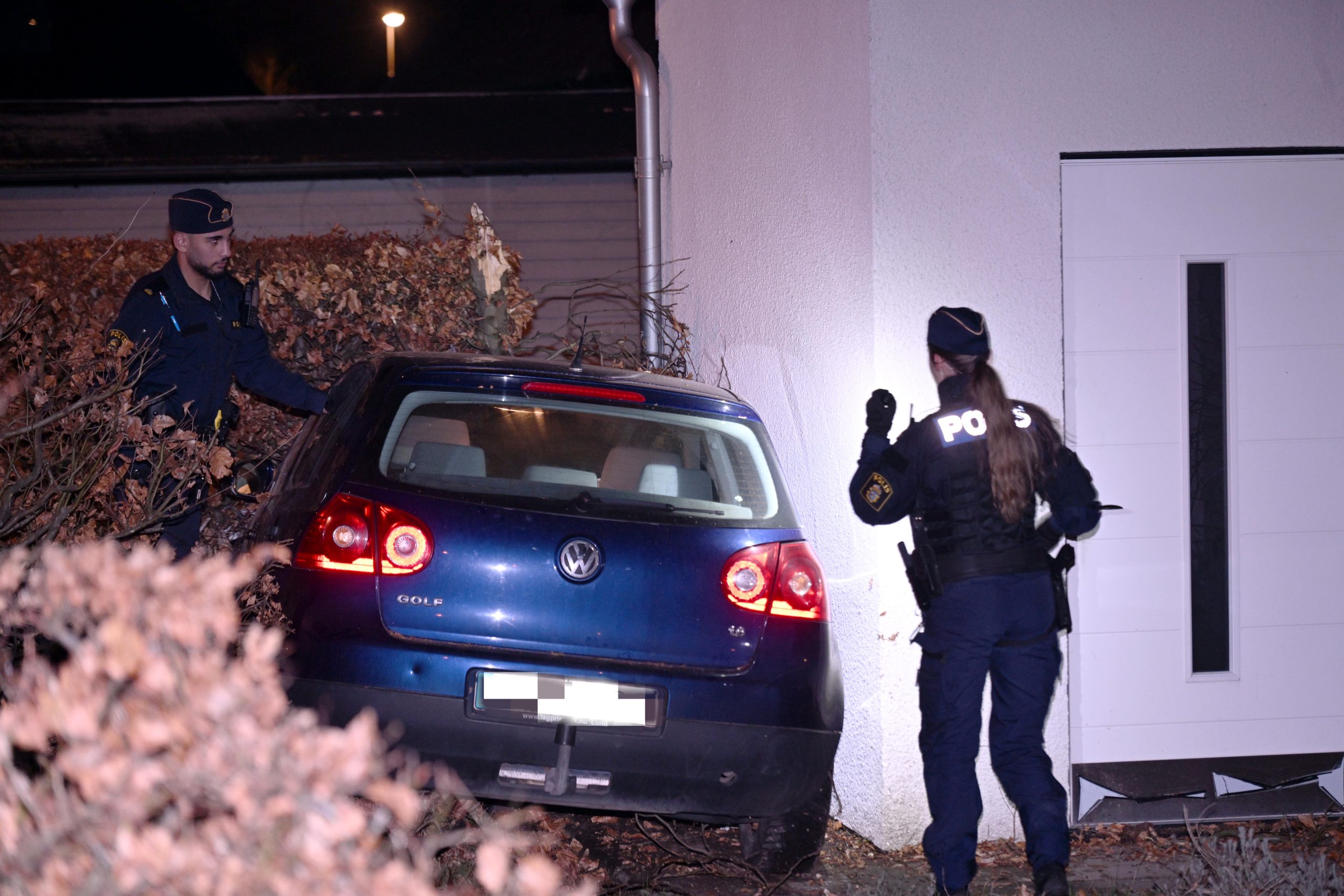 Räddningstjänst ambulans och polis kallades vid 23.05 till en bil som kört in i en trädgård på Ellenborgsvägen i Malmö. När räddningsmanskapet kom fram kunde man se en bil som i hög fart kört genom en rondell och slutligen hamnat i en trädgård nära ett hus. Bilföraren verkade förvirrad och omhändertogs av polis misstänkt för drograttfylleri. Ina personer i huset skadades vid olyckan.