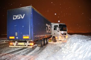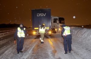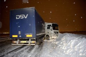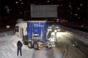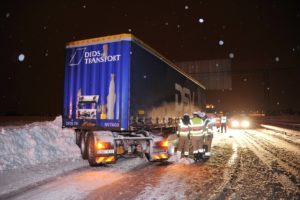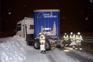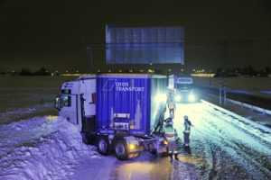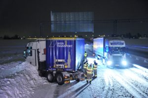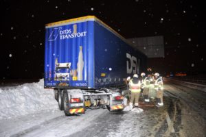 Ny olycka med trailerlastbil på E6-an vid Klagstorps trafikplats. Brandkåren larmades vid 01.50-tiden till ett trailerekipage som halkat av vägen och vikt sig på E6-an norrgående vid trafikplats Klagstorp. Inga personer skadades vid olyckan men dragbilen läckte diesel från en krossad bränsletank. Brandpersonal från Vellinge och Hylliestationen hjälptes åt att täta läckan och flera polispatruller dirigerade trafik sakta förbi olycksplatsen. Lastbilen hade inga vinterdäck och kanade av den glashala och krockade med en snövall. Bärgningsarbetet kommer sannolikt att ta många timmar.
