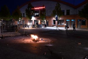 Vid 23-tiden blev det stökigt vid Kunskapsgymnasiet i Västra Hamnen. Hundratals ungdomar brände av fyrverkerier vid skolan. Polisen stängde av Östra Varvsgatan och efter detta lämnade de flesta av ungdomarna i bilar. På platsen fans en del brinnande fyrverkeribehållare kvar.