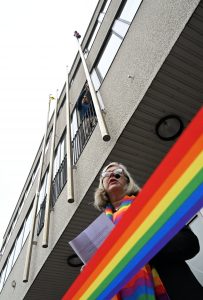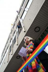 Pride flaggan hissades på Skurups kommunhus vid 17-tiden. Ett 40-tal Skurupsbor bevittnade invigningen av Prideveckan som invigdes av kommunstyrelsens ordförande Lena Axelsson S. Polis fans på plats inför alla eventualiteter.