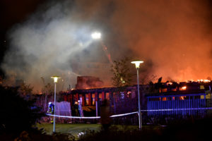 Brandkåren i Eslöv larmades vid 20-tiden till en brand i en större byggnad på Repslagaregatan i centrala Eslöv. När första brandstyrkan från Eslövs stationen kom fram brann det ut genom flera fönster på baksidan av byggnaden. Rökdykare med slangledning sattes in för utvändig släckning. Branden spred sig sedan snabbt upp i byggnadens takkonstruktion. Vid 21-tiden brann halva byggnaden och brandpersonalen fick koncentrera sig på att begränsa branden vid begränsningslinjen i mitten av byggnaden. Polisen spärrade av ett stort område runt brandplatsen som drog till sig hundratals nyfikna Eslövsbor. Vid 22.30-tiden höll brandpersonal på att ta hål i taket på den del av byggnaden som inte brunnit för att vädra ut heta rökgaser. Under kvällen och natten kommer ett stort antal brandmän att fortsätta jobba på platsen med släckning och eftersläckning. Vad som orsakat branden är i nuläget oklart, men under senaste tiden har Eslöv drabbats av otaliga anlagda bränder.