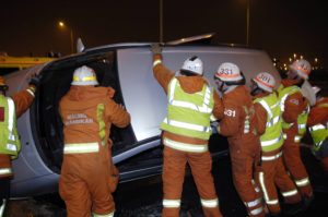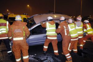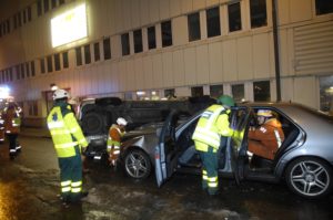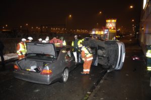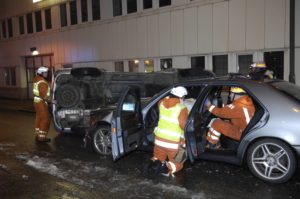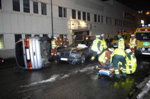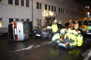 Trafikolycka på Rosendahlsvägen i Malmö vid 20.40-tiden i kväll. En personbil accelererade in i en stillastående personbil som precis kört ut från en däckfirma, enligt två vittnen en bit från olycksplatsen. Båda bilförarna skadades och den ena bilen välte vid den våldsamma kraschen.