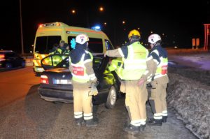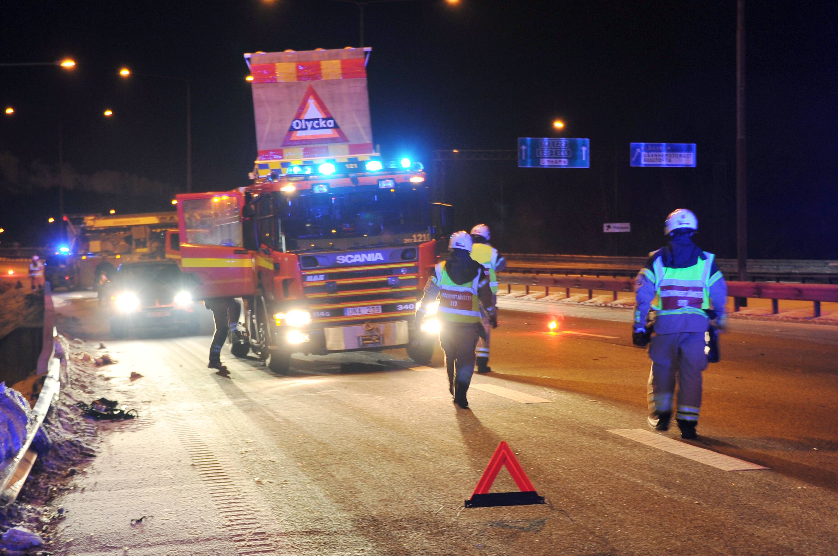 Trafikolycka singel på Inre Ringvägen i Höjd med väg 11vid 20.15-tiden. En eller två personer fördes med ambulans till sjukhus. Vägens ena körbana stängdes under räddningsarbetet som vara ca 20 minuter.