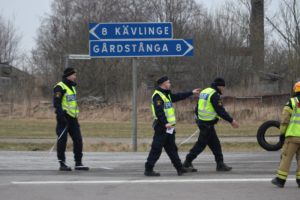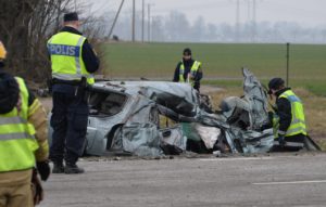 Två personer avled omedelbart och en skadades livshutande vid en trafikolycka mellan en personbil och två lastbilar på väg 104 utanför Kävlinge vid 15-tiden. När räddningsmanskapet kom fram till olycksplatsen kunde man konstatera att två personer i personbilen avlidit och att en person satt kvar i bilvraket med svårt fastklämd med livshotande skador. Brand och ambulanspersonal kunde klippa ut den skadade som snabbt fördes till sjukhus med en väntande ambulans. Lastbilsförarna chockades men behövde inte föras till sjukhus. I nuläget är det oklart exakt hur olyckan skett men en teori är att personbilen gjort en vänstersväng och träffats av först en lastbil och sedanden träffats av även den andra lastbilen som kom bakom. Vägen stängdes helt under räddnings och bärgningsarbetet som förväntas pågå ända till 21 i kväll.