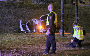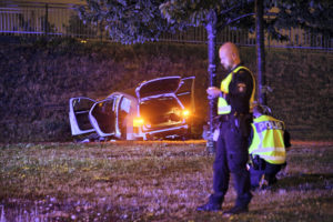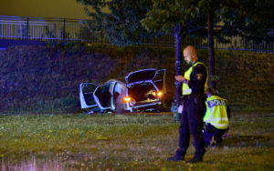 En våldsam singelolycka skedde vid 21.10-tiden på Lorensborgsgatan i höjd med Kroksbäck. En bil kom i hög fart i rondellen vid bollspelsvägen och slungades ut på en gräsmatta för att stanna vid en gångbro. Minst en person i bilen skadades och fick föras till sjukhus med ambulans. Vad som orsakat att föraren i hög fart missade rondellen är i nuläget oklart.