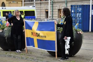 När Pegida skulle demonstrera vid 18-tiden på lördagen samlades ett 250-tal motdemonstranter från bland annat vänstern vid Stortorget. Pegida hade problem med sin högtalaranläggning och delar av talen gick inte att höra. En av motdemonstranterna blev tillsagd av en polis att lugna ner sig men detta kunde inte motdemonstranten acceptera utan dödshotade polismannen som sagt till honom. Motdemonstranten greps snabbt av flertalet civilklädda poliser. Ytterligare tre stökiga motdemonstranter omhändertogs av polisen då de störde ordningen. En polis på platsen säger att om bara Pegida fått stå själva och tala så hade maximalt ett 20-tal stått och lyssnat. Men nu när ett stort antal från vänstern kommit till platsen för att motdemonstrera får Pegida oförtjänt stor uppmärksamhete i bland annat media, avslutar polismannen innan han fortsätter sitt arbete på platsen.